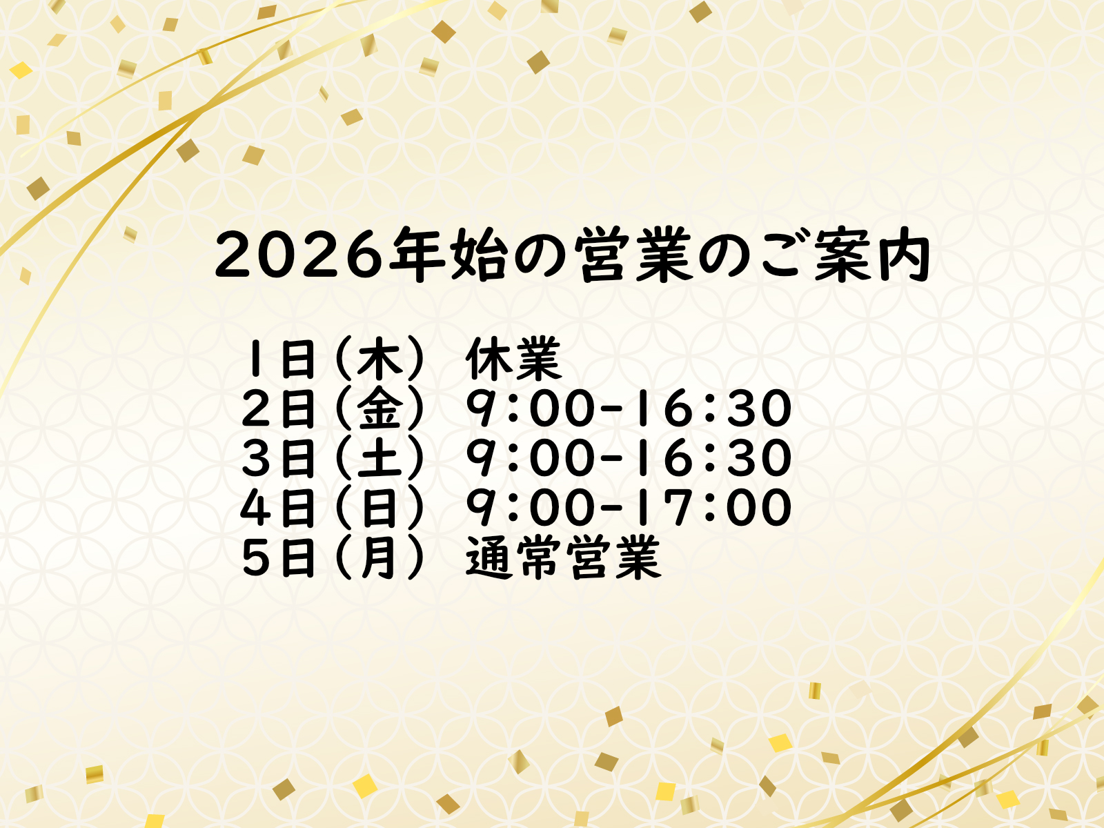 年末年始営業のご案内 2025年12月25日(木) Category: お知らせ, イベント, プライベート, メガネのお話, 時事, 日常, 片町商店街 年末年始の営業のお知らせです。 28日(日)まで通常営業。 29日(月)から1日(木)まで休業。 2日(金)より初売り。 営業時間は以下のようになります。 よろしくお願いいたします。 関連記事: 年末年始の営業のご案内 26日(日)は15時からの営業 27日(金)は16時までの営業 10/7(火)は15時から営業 明日17日(火)は臨時休業します
